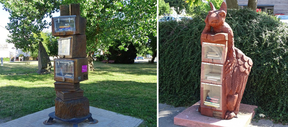 | Öffnungszeiten: | immer an der Europa-Kreuzung (Bücherbaum) und Makarenkostraße / Ecke Thälmann-Ring (Kinderbücherbaum) sowie Di 14 – 17 Uhr |